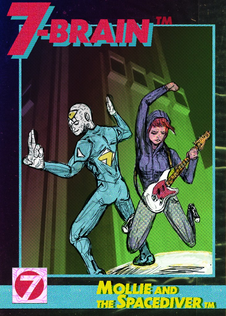 An homage to the X-Force trading cards that came poly-bagged with the original X-Force #1, along with Skybox’s Marvel Universe Series IV set, this unique collectible showcases one of the earliest concept sketches of Mollie and The Spacediver!